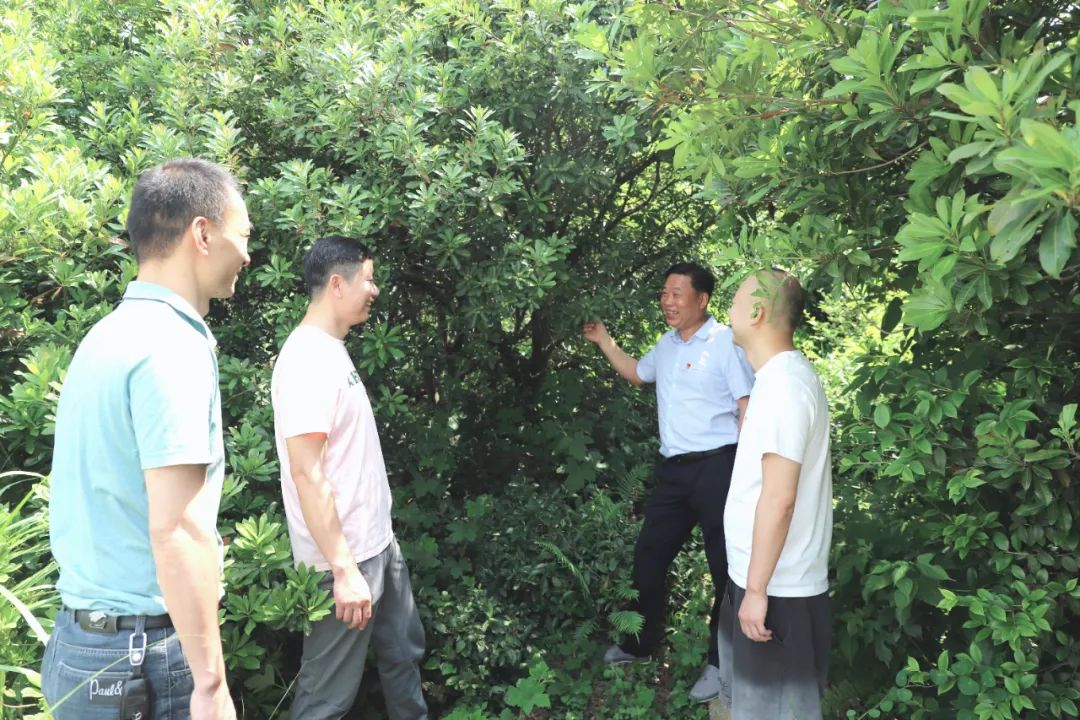 (圖為大田村村支書與駐村工作隊(duì)一起查看今年楊梅基地掛果情況)